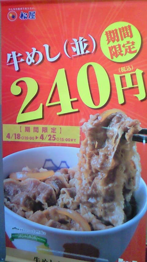 松屋で牛丼4/25まで250円らしい